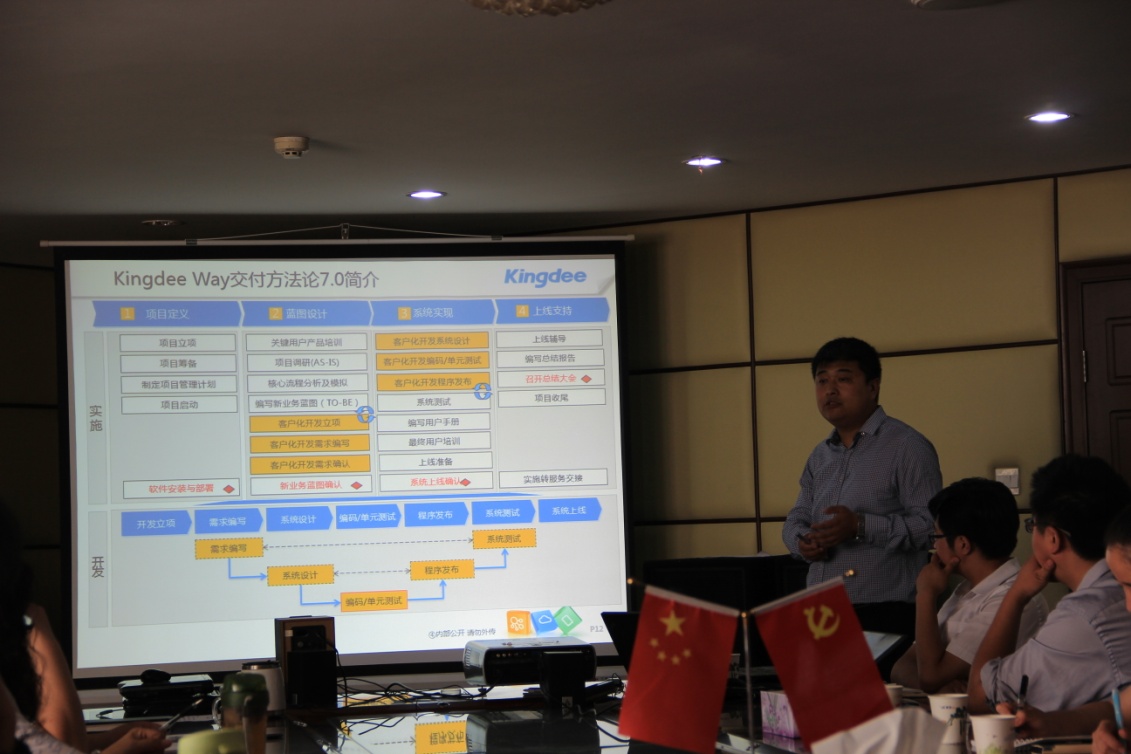 通過會(huì)議溝通,雙方共同確立了實(shí)施的相關(guān)事項(xiàng)、確定了各項(xiàng)目小組成員,金蝶方項(xiàng)目總監(jiān)做了“項(xiàng)目實(shí)施方案”和“金蝶實(shí)施方法論”的主題講解。