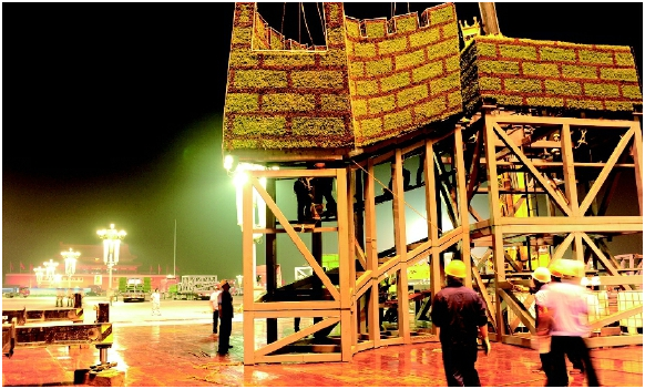 該工程總體形象為一組兩個(gè)長(zhǎng)城造型,分別設(shè)置在人民英雄紀(jì)念碑兩側(cè)以北的廣場(chǎng)上。首建集團(tuán)承擔(dān)施工的是紀(jì)念碑西側(cè)花壇的制作、安裝任務(wù)。這個(gè)花壇由2個(gè)烽火臺(tái)3榀步道城墻組成,烽火臺(tái)高度約12米、寬度約5米;步道城墻最高點(diǎn)高度約8.8米、寬度約2.1米。整體骨架采用鋼結(jié)構(gòu)框架形式,外表以植物覆蓋;▔傉嫉孛娣e1500平方米,鋼結(jié)構(gòu)件噸位150噸左右。